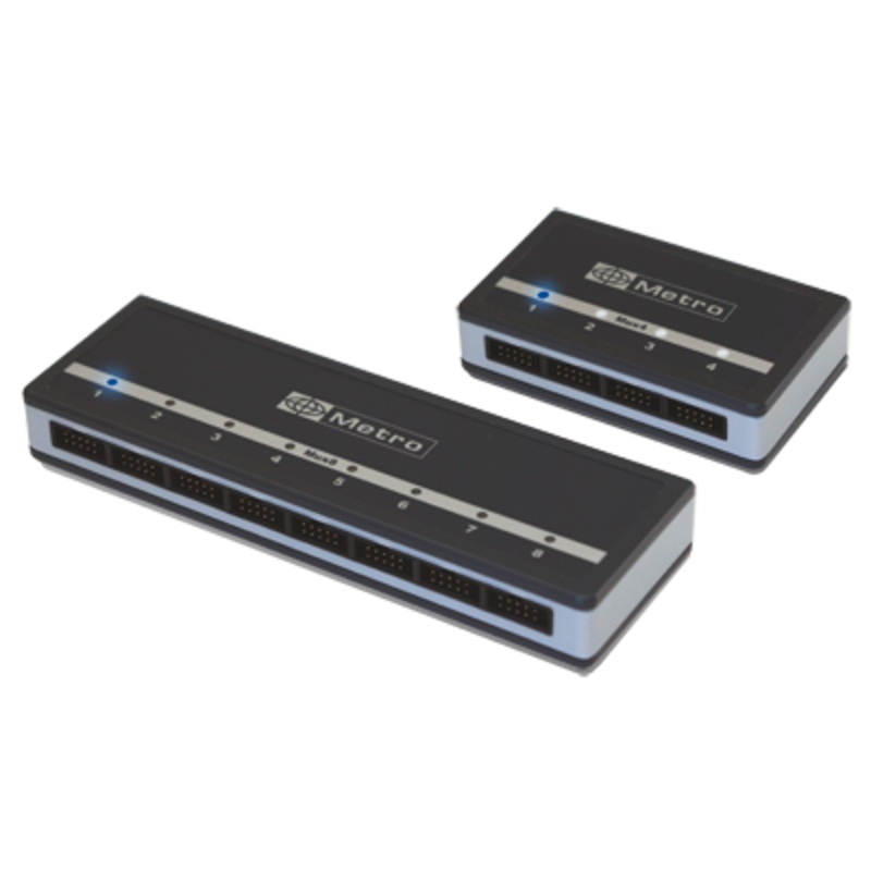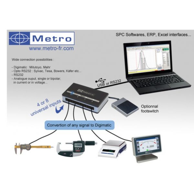 The Mux 4 and Mux 8 multiplexers allow the connection of 1 to 8 measuring instruments (calipers, micrometers, comparators, scales…) with a PC or other similar equipment equipped with a USB port or an RS 232 interface. The Mux 8 is only equipped with an RS 232 port