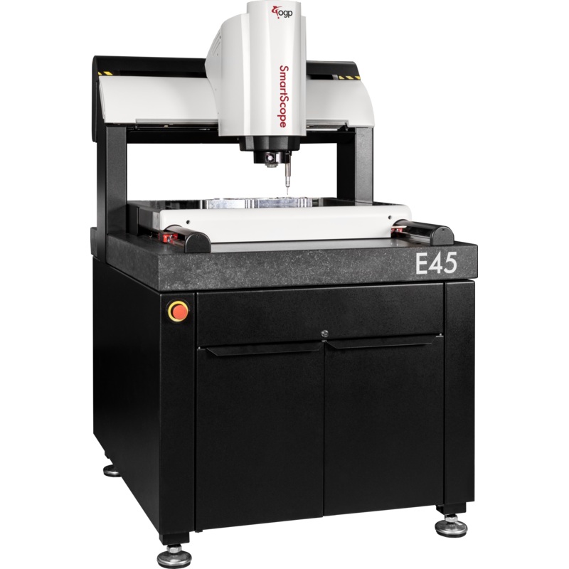 OGP SmartScope E45 is a floor model fully automatic 3-axis video metrology system featuring a large travel fixed bridge design. The fixed lens IntelliCentric-E optical system and Virtual Zoom provide a high-resolution image engineered for video edge detection metrology. SmartScope E45 also offers: