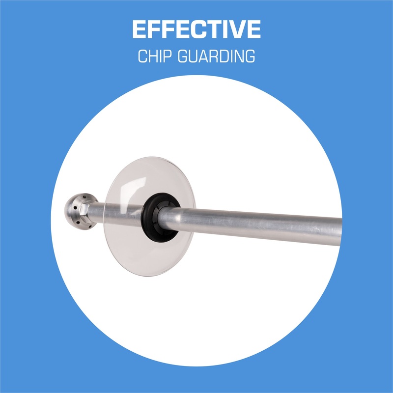 Protect against dangerous chip fly-back with the Guardair On-Guard Chip Shield. OSHA Standard 1910.242(b) mandates that effective chip-guarding be utilized when cleaning with compressed air. Slide the On-Guard onto a safety air gun for immediate compliance. Molded from impact resistant, clear polycarbonate, On-Guard allows an unobstructed and safe view of work surfaces. Ideal for bench-top or up-close cleaning applications. Available in three (3) versions designed to fit all Guardair PalmJet, Long John, XtraThrust, WhisperJet, Ultra Long John, Ultra WhisperJet, Ultra XtraThrust, and ReverseForce model extended-reach, safety air guns. Made in USA.