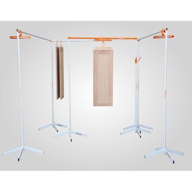 Hang doors by common cup-hooks or useHinge HooksorEFC Hinge Hooksfor completely unmarred surface results. The doors then hang on the spinner assembly, which is designed to give the painter complete control of the hanging part. Heavy-duty metal hangers eliminate the annoying and costly failure of wooden clothes hangers. 18 feet of drying line allows tight spacing of 50 drying doors since the custom hanger hook radius matches the drying pole, preventing parts from spinning.