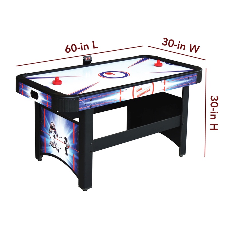 The 60-in Patriot Air Hockey Table is certain to bring home intense, fast-paced competitive fun that will keep your family and friends entertained for hours. The Patriot features rugged, reinforced legs and extra-thick CARB certified MDF construction that won’t shimmy or twist even during rigorous table play. The smooth, laminated play surface and super powerful blower motor enhance the speed of the table. With the electronic scoring system that automatically keeps track of who’s ahead in every game, scoring has never been easier! Vibrant, colorful, hockey graphics and attention to detail make this table a welcome addition to any rec room. Table comes with two 3-in strikers and two 2.5-in pucks. 180-day limited warranty.