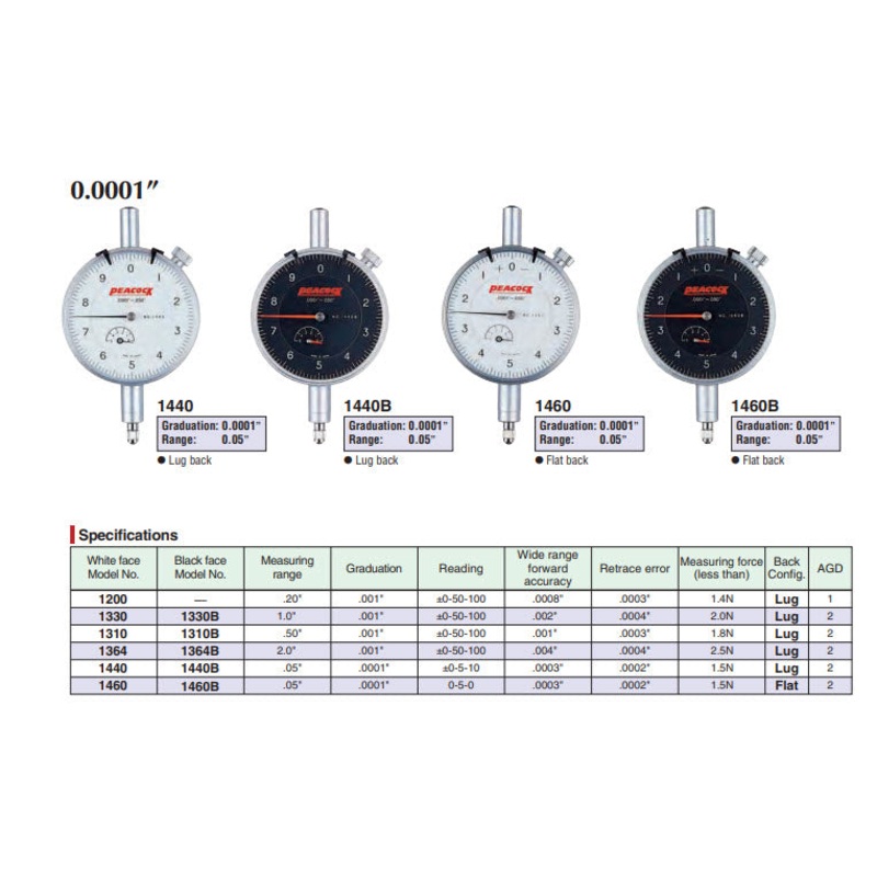 Peacock 1330 Dial Indicator, 0-1″ Range, 0.001″ Resolution, +/-0.001″ Accuracy, 0-100 Dial Reading, With Lug Back, White Face