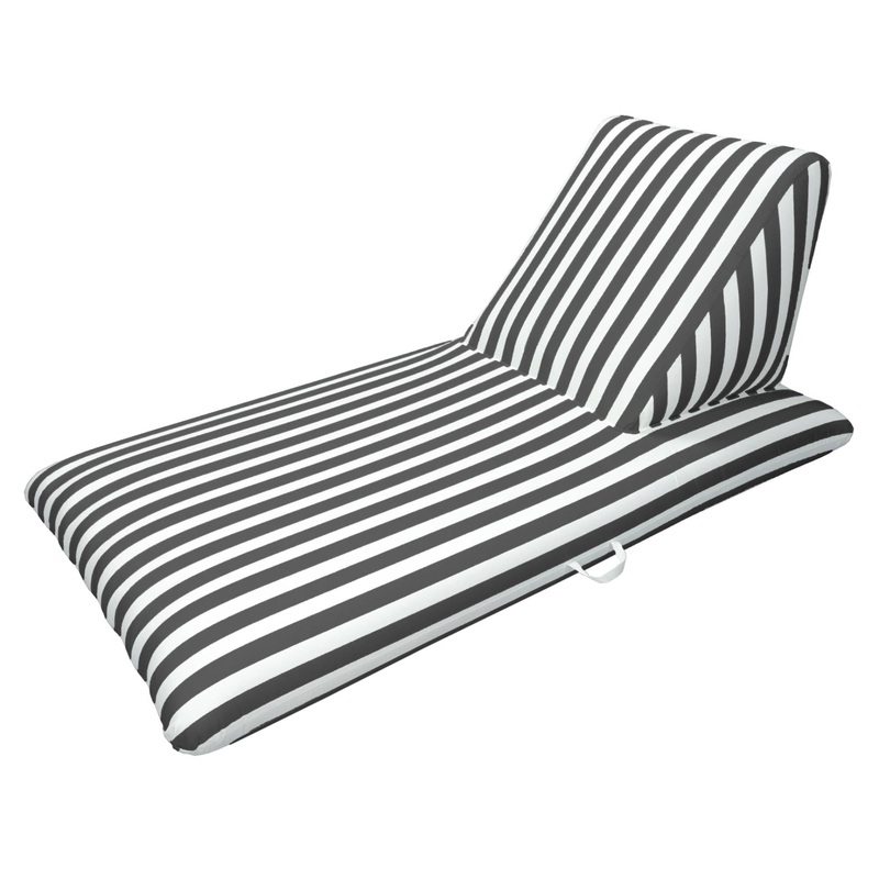 This chaise lounge is covered in durable polyester fabric, making it as durable as it is comfortable. Available in navy blue stripe, lime green stripe, red stripe, and black stripe and featuring a built-in backrest, this chaise lounge is just the float to take you to paradise.