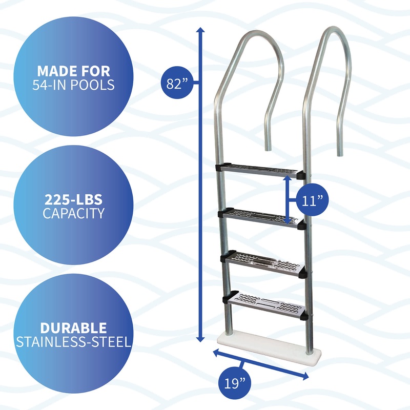 Ergonomically designed handrails shift your body’s weight forward, making it much easier to enter and exit the pool. Traditional handrails keep you completely vertical, which hinders your climbing ability. These handrails extend up to 36 inches above the deck, providing additional support without the worry of straining your back. The steps are 3 inches deep and non-skid for secure footing. This stainless-steel ladder is designed for pools 48 to 54 inches deep and can support up to 225 pounds. Its unique pivot bottom adapts to sloped pool bottoms. The package includes two aluminum flanges and stainless-steel hardware for secure deck mounting. It comes with a 1-year limited warranty. Please note: this ladder is not suitable for saltwater pools.