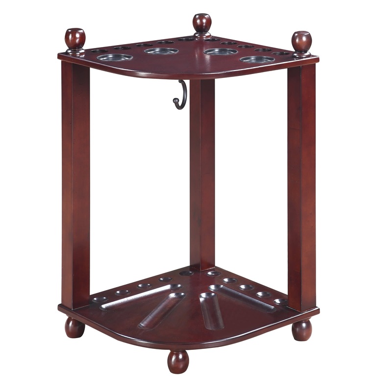 The Regent Corner Floor Cue Rack is essential for anyone who owns a billiards table. This furniture-quality rack has plenty of room to store cues, balls, racking triangles, and most other billiard accessory items. The Regent features 4 built-in, recessed, drink holders to keep your refreshments close to the action. Keep your game room neat and organized with this space-saving cue rack. 180-day limited warranty.