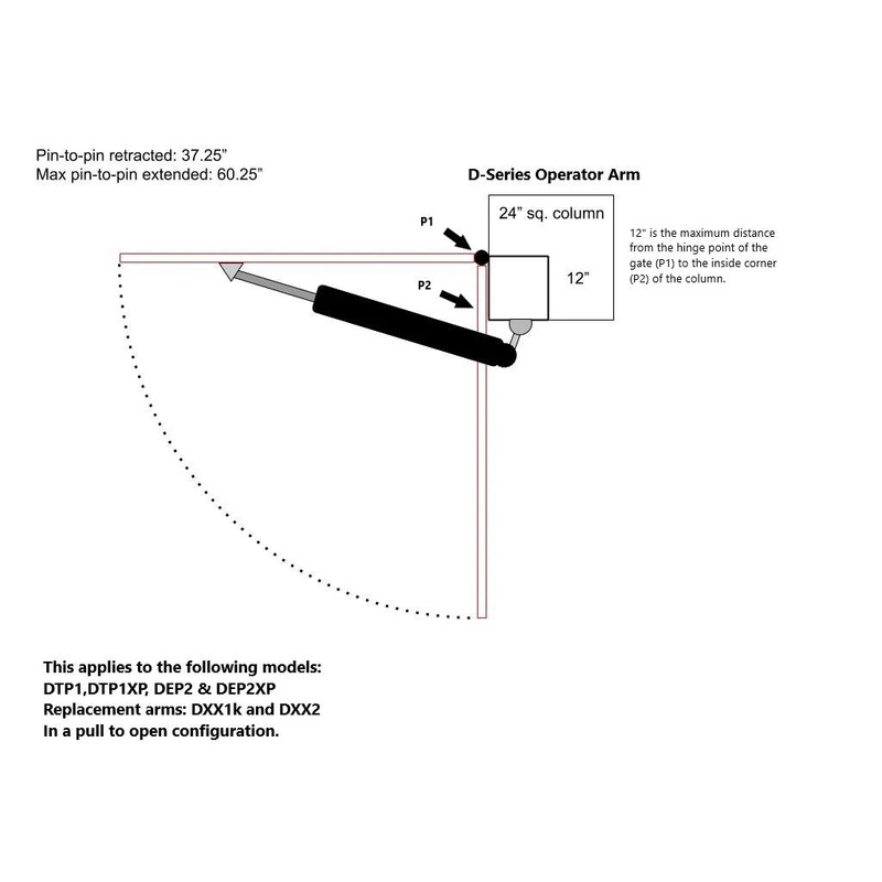 Replacement arm kit for DTP1 Single Gate Opener Kits and for the first arm only on DEP2 Dual Gate Opener Kits. Kits include: