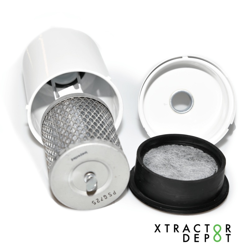 The Solberg DSV product series is an extremely effective vacuum pump discharge filter that offers 2 stages of filtration to remove both oil mist and undesirable odors from the pumps exhaust. The DSV is constructed of a robust epoxy coated steel and offers a compact, straight through design, with an integrated drain port to easily evacuate any collected contaminants. This innovative 2 stage design starts with a proprietary coalescing media that cleans the discharge air by capturing and coalescing oil mist. The oil-free air is then directed through an adsorptive activated carbon cartridge to remove any residual vapors and odors. The DSV was designed to be easily disassembled and serviced without the use of tools, allowing for extremely fast filter change out and minimal downtime.
