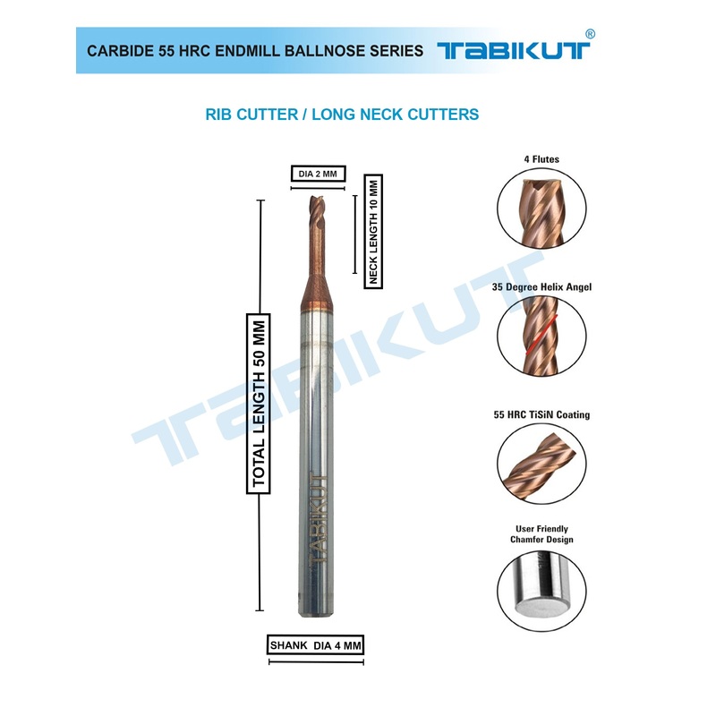 Rib Cutter endmill 2 mm- 2/4 flute 55 hrc pack of 1