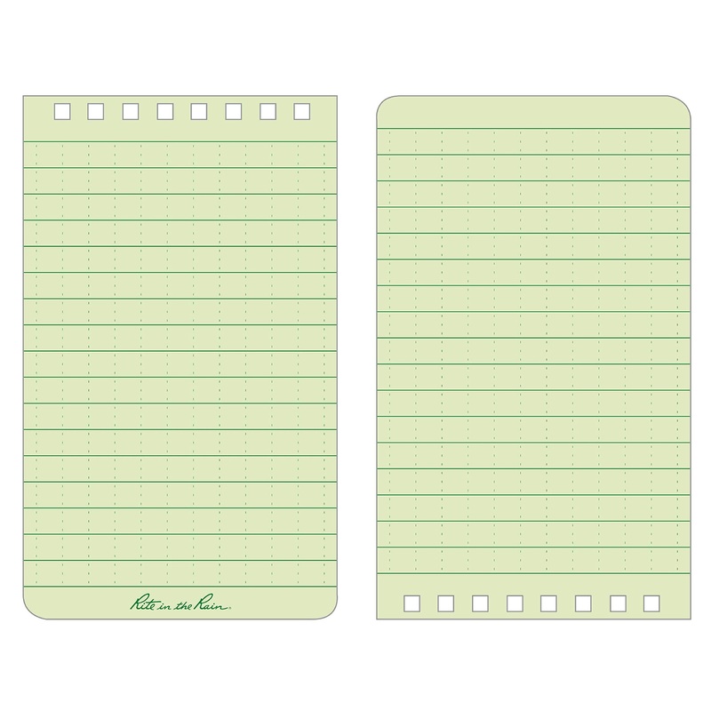 The 3″ x 5″ top-spiral notebook is small enough to fit comfortably in your pocket and tough enough to survive any of Mother nature’s onslaughts. This scrappy pocket notepad will survive rain, sweat, mud, snow, oil, and grease. The green paper is legible in bright sunlight. Impact-resistant Wire-O binding won’t lose its shape when tossed around in packs or put in a back pocket. The polydura cover defends your field notes from scratches and stains. Each notepad is printed with a standard and metric ruler on the back cover.