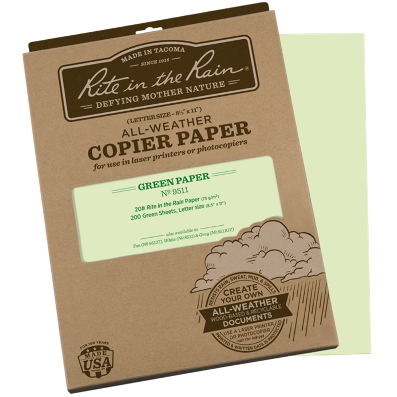“Rite in the Rain” Copier Pak, 8.5″ x 11″, Pkg of 200Sheets.Sub 20 Bond paper. Copy or laser your own all-weather forms, charts, maps and worksheets.Green.