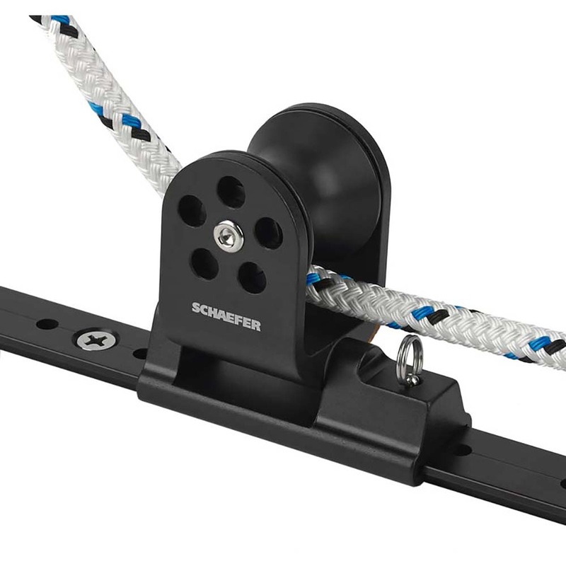 32-77 Twin Sheet Lead block. The anodized aluminum body is machined from 6061-T6 aluminum and articulates to ensure a proper lead. Anodized aluminum sheave runs on Nomex/Teflon bearing for a low-friction high strength sheave. Pin stop makes adjustment simple.