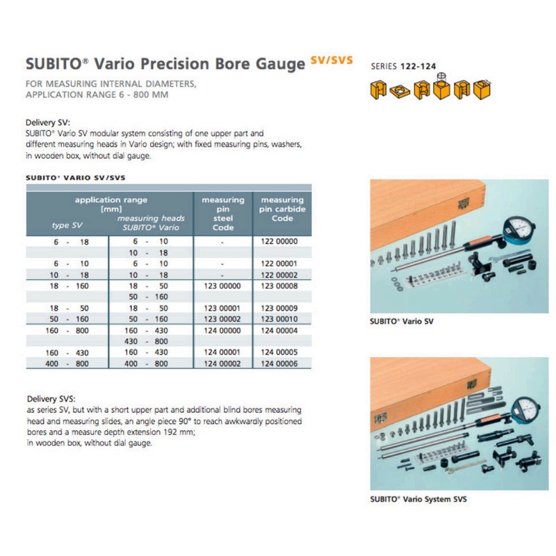 Delivery SV: Vario SV modular system consisting of one upper part and different measuring heads in Vario design; with fixed measuring pins, washers, in wooden box, w/o dial gauge
