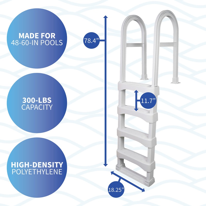 Enter and exit your above-ground swimming pool safely and confidently with the Snap-Lock Deck Ladder. Crafted from high-density polyethylene, this maintenance-free ladder is built to last, resisting rust and corrosion. Its unique, snap-lock construction eliminates the need for metal hardware, simplifying the installation process. Suitable for above-ground pools up to 60 inches deep, its ideal for taller pools and decks. The ladder features double ergonomic handrails and 5.5-inch-deep non-skid treads for safe climbing. The pivotal bottom tread with an anti-slip base adapts to sloping pool bottoms, ensuring stable grounding. It includes white plastic flanges for secure deck mounting and can support up to 300 lbs. Comes with a 1-year limited warranty.