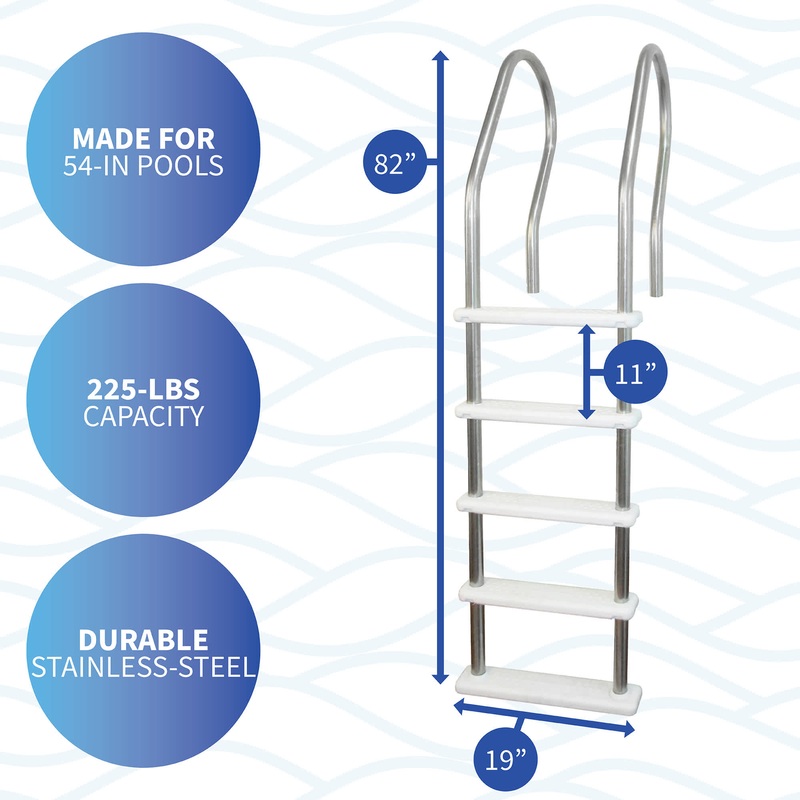 Ergonomically designed handrails shift your body’s weight forward, making it much easier to enter and exit the pool. Traditional handrails keep you completely vertical, which hinders your climbing ability. These handrails extend up to 36 inches above the deck, providing additional support without the worry of straining your back. The steps are 3 inches deep and non-skid for secure footing. This stainless-steel ladder is designed for pools 48 to 54 inches deep and can support up to 225 pounds. Its unique pivot bottom adapts to sloped pool bottoms. The package includes two aluminum flanges and stainless-steel hardware for secure deck mounting. It comes with a 1-year limited warranty. Please note: this ladder is not suitable for saltwater pools.