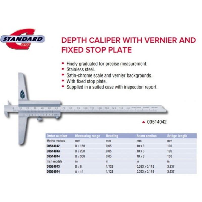 Standard Gauge 00514042 Metric Vernier Depth Gauge without Fine Adjustment, Caliper Type, Range 0-150mm , Graduation 0.05mm , 100mm base