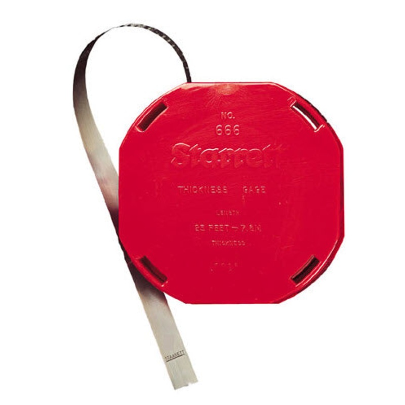 • The Starrett 666 Series Thickness Gauge or Feeler Stock, Model 666-1 1-2 comes in a plastic dispenser case and is 25′ long . This handy product Series is housed in a convenient rewindable dispenser roll. Having the thickness stock in a case makes it very useful for cutting off the required length for adjusting tappets, spark plugs, distributor points, checking bearing clearances and gear play, fitting pistons, rings and pins, gaging narrow slots, etc.