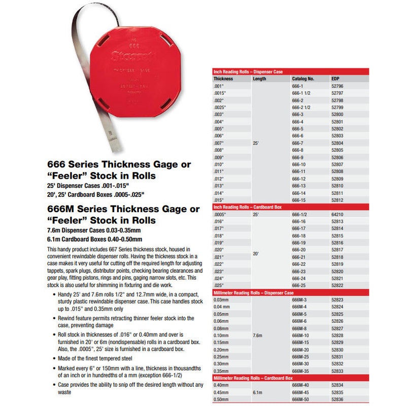 - The Starrett 666 Series Thickness Gauge or Feeler Stock, Model 666-1 1-2 comes in a plastic dispenser case and is 25′ long . This handy product Series is housed in a convenient rewindable dispenser roll. Having the thickness stock in a case makes it very useful for cutting off the required length for adjusting tappets, spark plugs, distributor points, checking bearing clearances and gear play, fitting pistons, rings and pins, gaging narrow slots, etc.