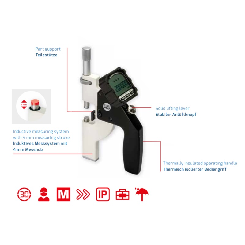 The digital passameter with a solid measuring equipment body and a novel inductive measuring system achieves a very high measuring accuracy and repeatability. The weight of the measuring tool rests on the workpiece due to the anvil which can be adjusted from the top. The measuring probe which is moved in from below has a free stroke of 4 mm and ensures a very high repeatability thanks to its constant measuring force. The display resolution is 0.1 m. The large measuring surface of 10 mm ensures stable support on the specimen. All recorded measuring values can be processed externally with an optional wireless module. The adjustable tolerance function simplifies the use in serial measurements.