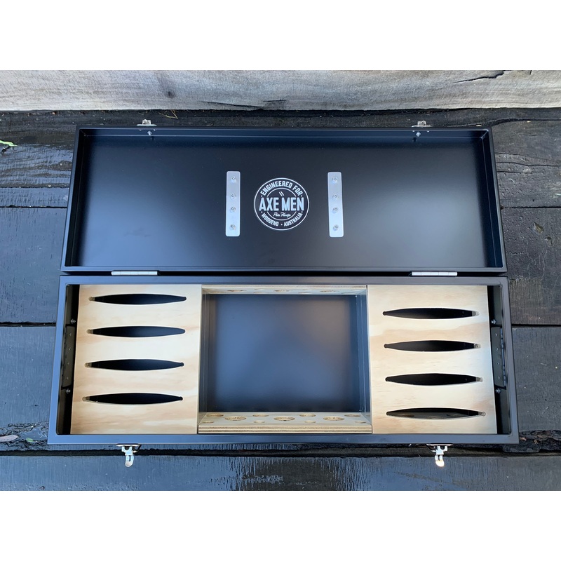 New super sized axe box that holds 8 axes. Fully welded and powder coated axe box that holds your 8 favourite axes in our custom inserts.