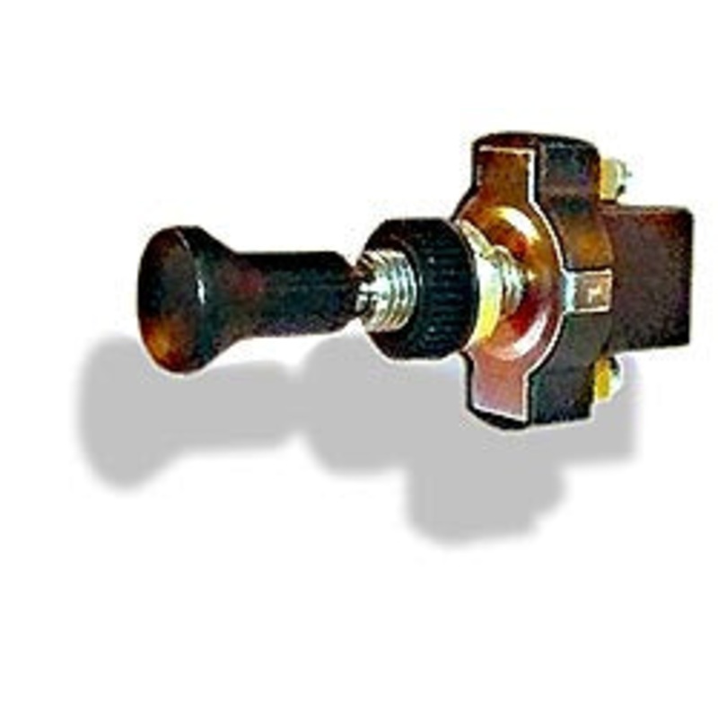 Pull on/Push off switch with round plastic knob with 2 screw terminals and a longer neck for mounting into thicker panels. The switch is rated 16A@12V (8A@24V). Fits 8mm hole in a panel approximately 12mm thick. Suitable for spot/fog lights, single speed wipers, reverse lights etc.