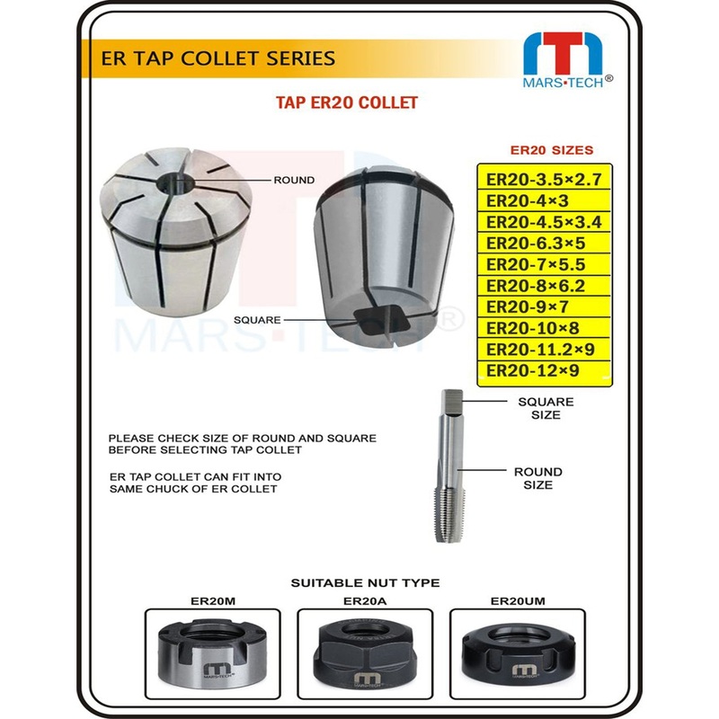 TAP COLLET ER20|ROUND 3.5 X SQUARE 2.7|ROUND 4 X SQUARE 3|ROUND 4.5 X SQUARE 3.4|ROUND 5 X SQUARE 4|ROUND 6 X SQUARE 4.9|ROUND 6.3 X SQUARE 5|ROUND 7 X SQUARE 5.5|ROUND 8 X SQUARE 6.2|ROUND 9 X SQUARE 7|ROUND 10 X SQUARE 8|ROUND 11.2 X SQUARE 9|ROUND 12 X