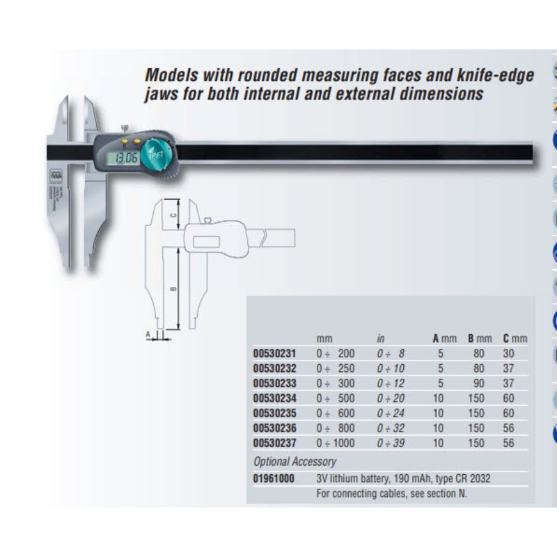 Tesa 00530235 Twin-Cal IP67- Models with rounded measuring faces for internal dimensions and knife edge jaws, 600mm/24″, Resolution 0.01mm/0.0005″, IP67 Coolant Proof