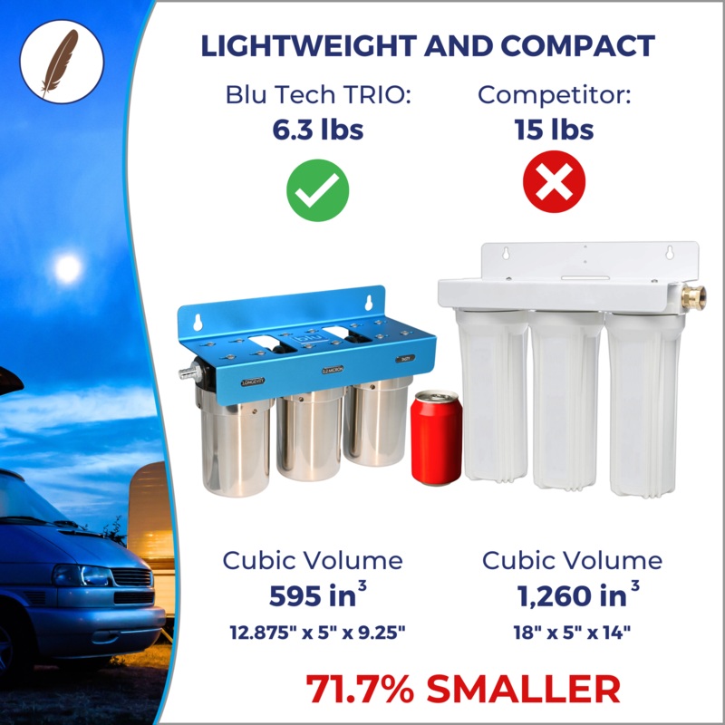 ULTRA-COMPACT DESIGN: Blu Technologys 5-inch filters allow the system to be significantly smaller than conventional systems with 10-inch filters, allowing the TRIO to fit in tight spaces. Perfect for Vans, RVs, and Tiny Homes! Other 3-Stage Fixed Mounted water filtration systems on the market with 10-inch filters weigh up to 15-24 lbs, while the Blu Tech TRIO weighs only 6.3 lbs!