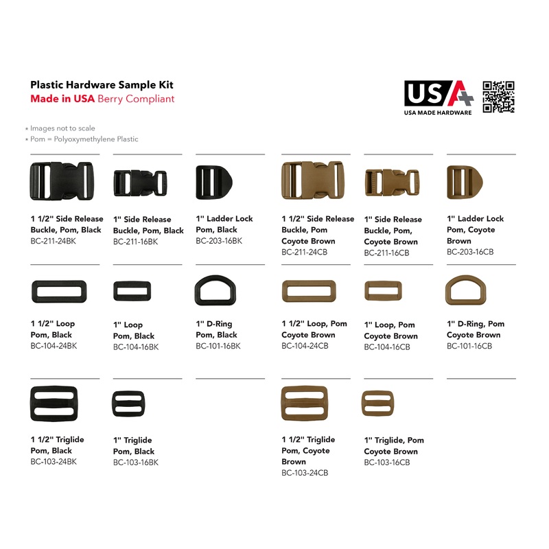 If you want your plastic hardware made in the USA or Berry Compliant, we have you covered. Our plastic hardware sample kit contains 2x sample of each piece of plastic hardware from our new made in the USA line.