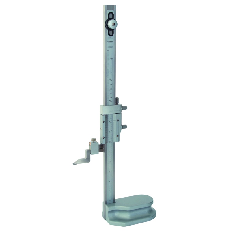 A Mitutoyo vernier height gauge with a dual unit, adjustable main scale. Stainless steel construction with easy-to-read, satin-chromed scales.