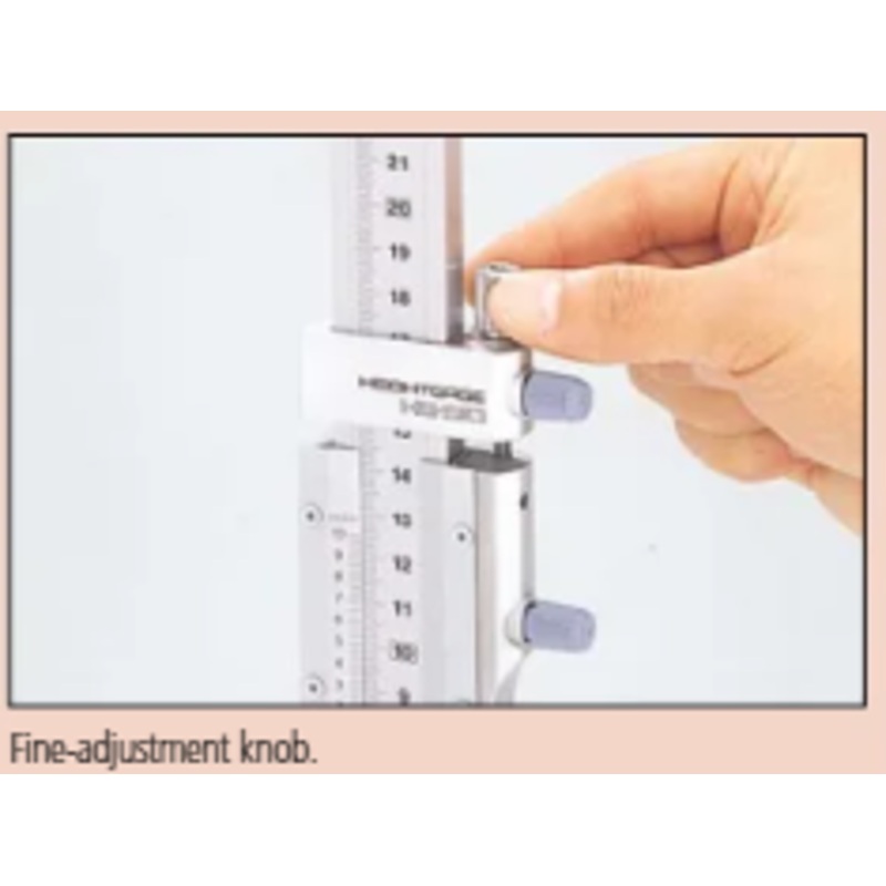 A Mitutoyo vernier height gauge with a dual unit main scale. Stainless steel construction with easy-to-read, satin-chromed scales.